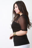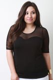 This plus size top features a round neckline, elbow sleeves construction, and contrasting mesh top and smooth stretchy knit fabrication. Accessories sold separately. Made in U.S.A. Self: 65% Rayon, 30% Nylon, 5% Spandex. Contrast: 90% Nylon, 10% Spandex.