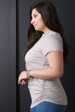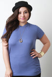 This plus size top features rib knit, mock neck, short sleeves, ruched sides, and back keyhole cutout. Accessories sold separately. 97% Rayon, 3% Spandex.