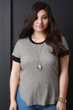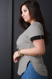 This casual plus size top features soft rib knit, thin horizontal stripes, round neckline, short sleeves with gold-tone button accents, side vents, and curved hem. Accessories sold separately. 97% Rayon, 3% Spandex.