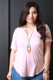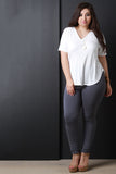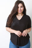 This plus size top features a stretchy ribbed knit fabrication, v-neckline, center seam detail, short sleeve construction, and curved hemline. Accessories sold separately. Made in U.S.A. 95% Rayon, 5% Spandex.