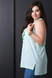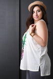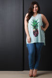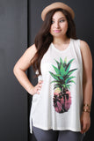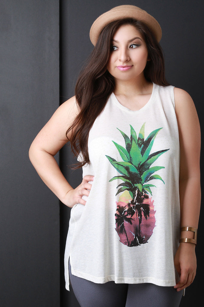 This top features a jersey knit fabrication, pineapple graphic print with a sunset silhouette, round neckline, and sleeveless construction. Finished with a high low hemline. Accessories sold separately. Made in U.S.A. 85% Polyester, 15% Flex.