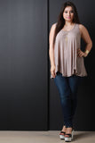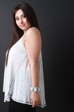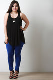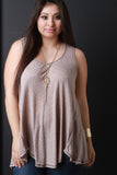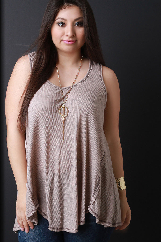 This comfy top features a soft rib knit fabrication, scoop neck line, racer back cut, gather detail, loose flowy fit, finished with a raw edge detail. Accessories sold separately. Made in U.S.A. 65% Polyester, 35% Rayon.