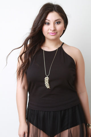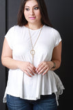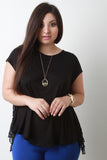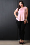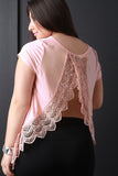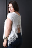 This plus size top features a soft knit fabrication, open back with beautiful crochet lace panels detailing, short sleeves, round neckline, and asymmetrical hem. Accessories sold separately. Made in U.S.A. 95% Rayon, 5% Spandex.