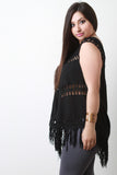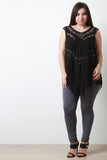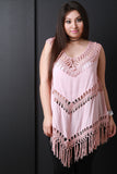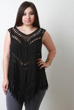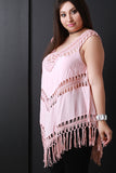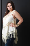 This plus size top features a woven knit fabrication, sleeveless fit, crochet and macrame knot details, and finished with fringe hemline. Accessories sold separately. 40% Acrylic, 40% Cotton, 20% Polyester.