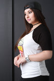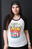 This plus size tee features a soft jersey knit fabrication, "POPCORN" graphic print at front, banded round neckline, contrasting short raglan sleeves, and side cinched detail. Accessories sold separately. Made in U.S.A. 97% Rayon, 3% Spandex.