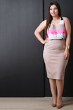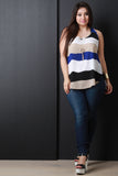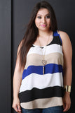 This plus size top features a flowy striped chiffon, sleeveless design, racerback with gathered detail, and high-low curved hemline. Top comes with a heart-shape pendant necklace. Other accessories sold separately. Made in U.S.A. 100% Polyester.