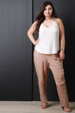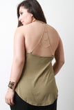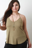 This cute plus size top features a v neckline, halter strap, removable gold tone chain triangle piece, rounded high low hemline, finished with a loose flowy fit. Accessories sold separately. Made in U.S.A. 96% Rayon, 4% Spandex.