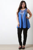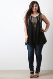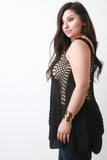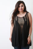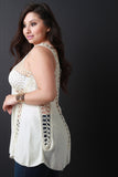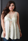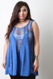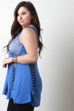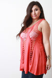 This top features a lightweight fabrication with crochet panels, scooped neckline, sleeveless design, scalloped hem, and loose-fit flowy construction. Accessories sold separately. 40% Acrylic, 40% Cotton, 20% Polyester.
