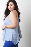 This cute plus size top features a mock neckline, sleeveless cut in shoulder design, stripe pattern, racerback, wide shark bite hemline, loose flowy fit. Accessories sold separately. Made in U.S.A. 95% Rayon 5% Spandex.