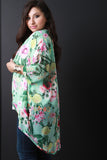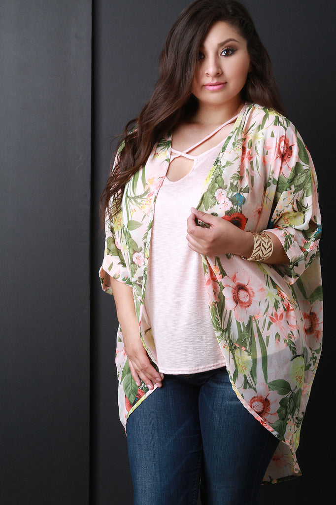 This breezy plus size cardigan features a tropical floral print, sheer chiffon fabrication, cuffed dolman sleeve, open front and a rounded cocoon silhouette. Accessories sold separately. Made in U.S.A. 100% Polyester.
