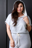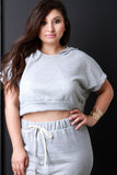 This plus size top features a heathered knit fabrication, round neckline with back hoodie, cap sleeves fit, and banded cropped hemline. Accessories sold separately. Made in U.S.A. 60% Cotton, 40% Polyester.