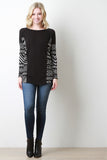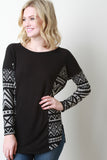 This long sleeve top features solid knit main, tribal design panels, round neckline, dropped shoulders, and side slits. Accessories sold separately. Made in U.S.A. 63% Polyester, 34% Rayon, 3% Spandex.