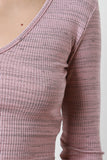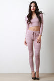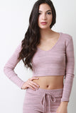 This crop top features marble rib knit, v-neckline with attached hood, and long sleeves. Accessories sold separately. Made in U.S.A. 48% Rayon, 48% Polyester, 4% Spandex.