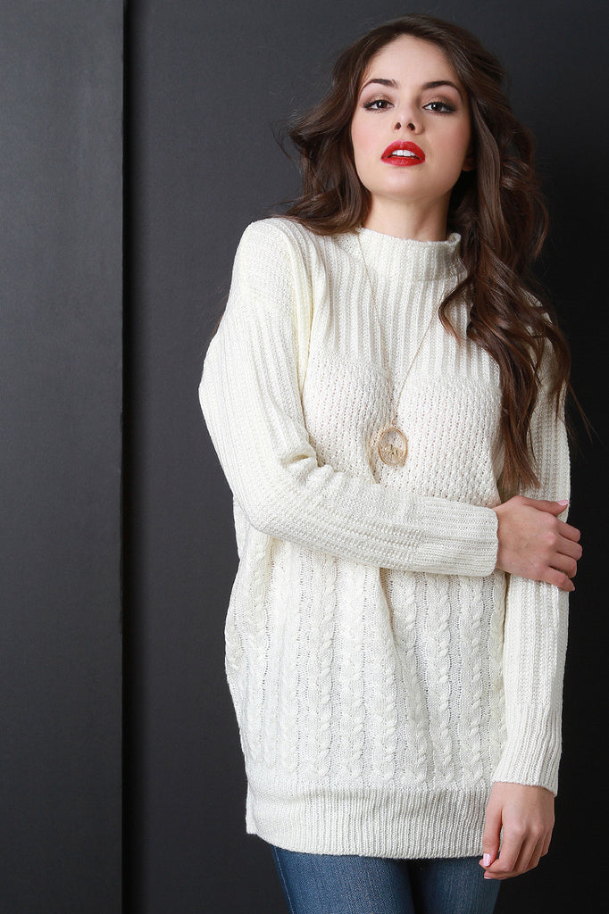 This cozy top features a mixed cable knit design, mock neckline, long sleeves, and straight hemline. Finished with a rib trim at cuffs and hemline. Accessories sold separately. 85% Acrylic, 15% Wool.