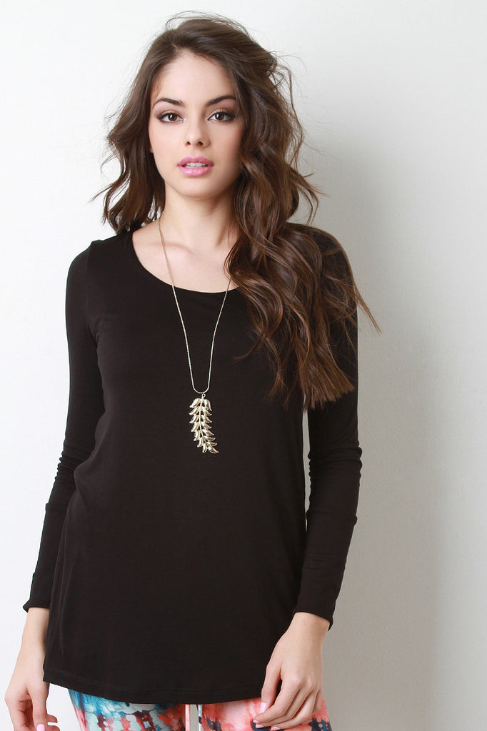 A jersey top featuring a scooped neckline, long sleeves with long cuffs, and a relaxed fit. Accessories sold separately. Made in USA. 95% Rayon, 5% Spandex.