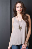 A relaxed fit tank top featuring lightweight slub jersey knit, a round neckline, and raw edges. Finished with a high-low hemline. Accessories sold separately. 45% Rayon, 55% Silk.