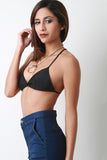 This bralette top features a triangle top front, spaghetti shoulder straps, and a caged racerback. Accessories sold separately. Made in U.S.A. 96% Polyester, 4% Spandex.
