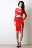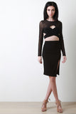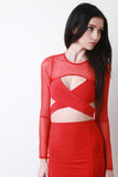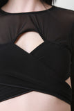 This semi sheer long sleeve crop top features a round neck and self-tie up back. Accessories sold separately. Made in U.S.A. 96% Polyester, 4% Spandex.