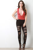 This sleeveless bodysuit features a plunging v-neckline with a T-strap cage, brief bottom, and double snap button closure. Accessories sold separately. Made in U.S.A. 96% Polyester, 4% Spandex.