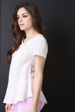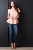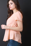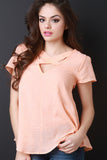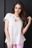 This casual top features a v-neck with a crisscross strap design, short sleeves, and finished with a flared hemline . Accessories sold separately. Made in U.S.A. 55% Cotton, 45% Rayon.