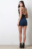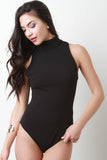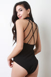 This sleeveless bodysuit features a mock neckline with double button closure at nape, crisscross cage back, and brief bottom with double snap button closure at crotch. Accessories sold separately. Made in U.S.A. 96% Polyester, 4% Spandex.