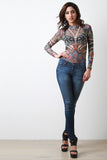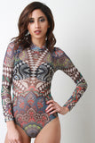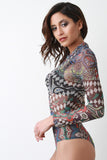 This bodysuit features lightweight semi-sheer fabric, mixed pattern print, mock neck, long sleeves, and finished with double snap button closure at crotch. Accessories sold separately. Made in U.S.A. 100% Polyester.