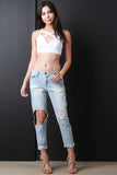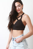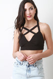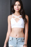 This crop top features a jersey knit with cross-back straps, detailed with a cross-front V-neck, and banded waist. Accessories sold separately. Made in U.S.A. 95% Cotton, 5% Spandex.