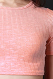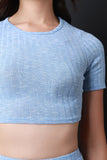 This top features ribbed knit fabrication, round neckline, short sleeve construction, and a crop hemline. Accessories sold separately. Made in U.S.A. 97% Cotton, 3% Spandex.