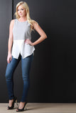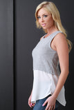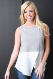 This casual top features a jersey knit fabrication, sleeveless construction, and a round neckline. Finished with a two tone color design, an asymmetrical and high low hemline. Accessories sold separately. Made in U.S.A. Self: 50% Polyester, 30% Cotton, 13% Rayon. Contrast: 100% Polyester.