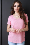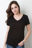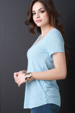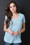 This lovely t-shirt features a soft knit fabrication, v neck, a short sleeve, and raw hemline. Accessories sold separately. Made in U.S.A. 62% Rayon, 38% Polyester.