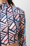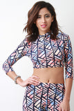 This soft knit crop top features a patterned print fabrication, mock neck, long sleeves, and cropped hemline. Accessories sold separately. Made in USA. 95% Polyester, 5% Spandex.