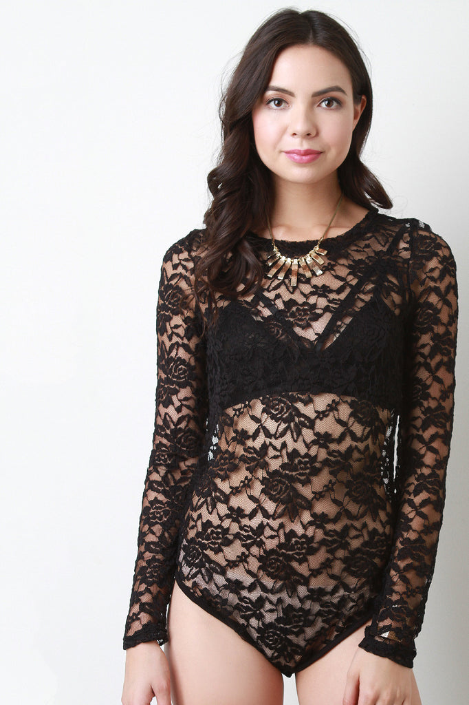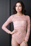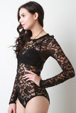 This bodysuit features a semi-sheer floral lace fabrication, round neckline, long sleeves, brief bottom, and finished with a double snap button at crotch. Made in U.S.A. 96% Polyester, 4% Spandex.