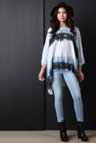 This top features a tie dye fabrication design, round neckline, short dolman sleeves, boxy cut design, and finished with a high low hemline. Accessories sold separately. Made in U.S.A. 50% Cotton, 50% Rayon.