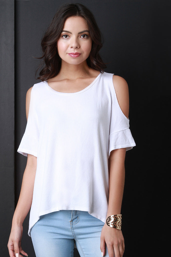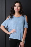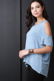 This casual top features a round neckline, short sleeves with a cold shoulder design and jersey knit fabrication. Finished with a high low hemline and a vertical seam in the back. Accessories sold separately. Made in U.S.A. 79% Rayon, 18% Polyester, 3% Spandex.