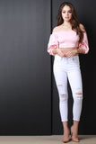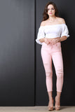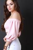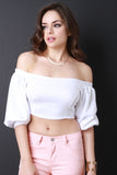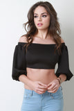 This top features a bardot neckline with puff style three quarter sleeves, princess seams, knit fabrication and crop hemline. Accessories sold separately. Made in U.S.A. 95% Polyester, 5% Spandex.