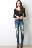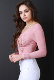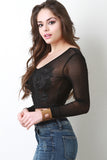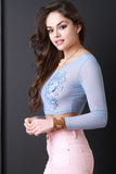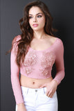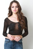 This semi-sheer mesh top features a round neckline, long sleeves, crop hemline, and embroidery floral lace patch at breast. Accessories sold separately. Made in U.S.A. 95% Polyester, 5% Spandex.