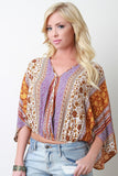 This blouse features bohemian floral style print, surplice neckline with a snap button closure, quarter-length kimono sleeve, elasticized hemline, and surplice back with a self-tie closure at nape. Accessories sold separately. 100% Rayon.