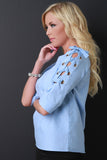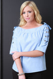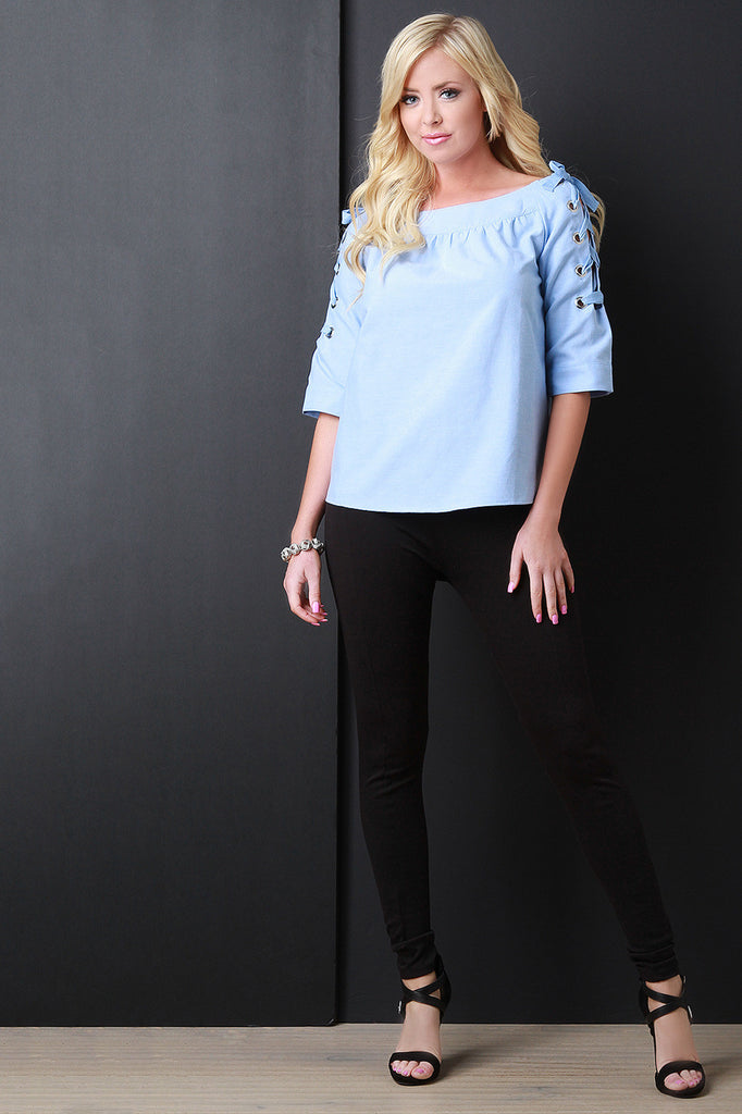 This top features a boat neckline, quarter-length sleeves with corset lace-up design, and boxy relax fit. Accessories sold separately. 50% Cotton, 50% Polyester.