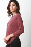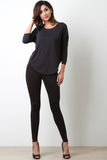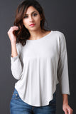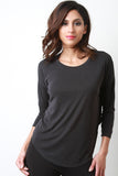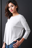 This soft jersey knit top features a crew neckline, quarter-length sleeves, and a asymmetrical crop back hemline. Accessories sold separately. 64% Modal, 36% Polyester.
