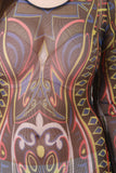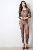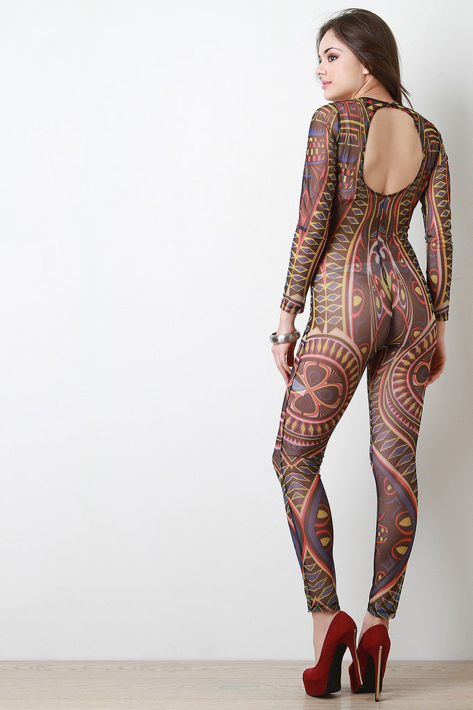 This sleek jumpsuit features a tribal pattern print throughout, semi-sheer fabrication, open back, high rounded neckline and long sleeve construction. Finished with a button closure at the nape. Accessories sold separately. Made in U.S.A. 100% Polyester.