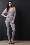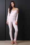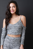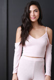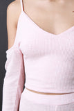 This crop top features cold shoulder cut out sleeves, a v cut neckline, cropped hem, self lined, rib knit fabrication. Accessories sold separately, Made in U.S.A. 95% Polyester. 5% Spandex.