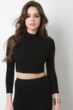 This crop top features a mock neck, three quarter length sleeves, knit fabrication. Accessories sold separately. Made in U.S.A. 96% Rayon, 4% Spandex.