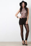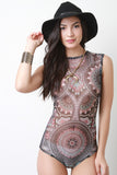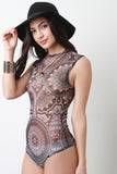 This bodysuit features a semi sheer mesh fabrication, sleeveless design, high neckline, engineered abstract bohemian print, and double snap closure at crotch. Accessories sold separately. Made in U.S.A. 88% Polyester 12% Spandex.