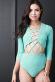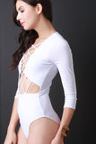 This bodysuit features three quarter sleeves, plunging neckline, strappy front cut out, knit fabrication, and invisible zipper back closure. Accessories sold separately. Made in U.S.A. 96% Polyester, 4% Spandex.