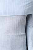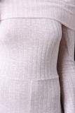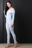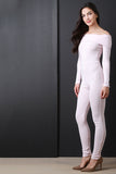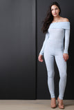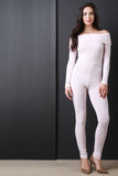 This jumpsuit features a wide ribbed knit fabrication, off shoulder bardot neckline,long sleeves, and figure hugging silhouette. Finished with taper cut legs. Accessories sold separately. Made in U.S.A. 95% Polyester, 5% Spandex.