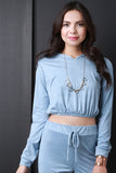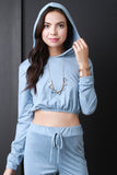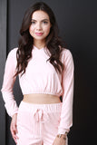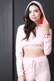 This top features a vegan suede fabrication, long sleeve construction, round neckline with attached hoodie, and banded cuffs. Finished with a cropped elasticized hem. Accessories sold separately. Made in U.S.A. 95% Polyester, 5% Spandex.