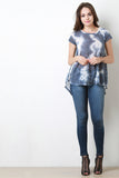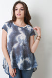This adorable top features lightweight semi-sheer knit, cloudy tie dye design, round neckline, short sleeves, relaxed fit, back keyhole cutout with self-tie lace, and high-low curved hemline. Accessories sold separately. Made in U.S.A. 78% Polyester, 22% Rayon.