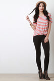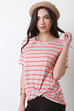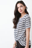 This casual tee features a striped print, short sleeves, a relaxed fit, knotted front detail and a soft knit fabrication. Accessories sold separately. Made in U.S.A. 65% Polyester, 35% Rayon.