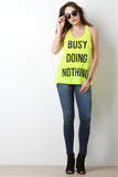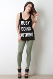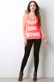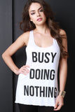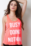 This tank top features a jersey knit fabrication with "Busy Doing Nothing" print at front, scooped neck, sporty racerback design, and a wide hem. Accessories sold separately. Made in U.S.A. 96% Rayon, 4% Spandex.