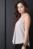 This top features a crinkle fabrication, round neckline, sleeveless construction, and a crochet lace trim detail on back. Finished with a flowy round hemline. Accessories sold separately. Made in U.S.A. 96% Polyester. 4% Spandex.
